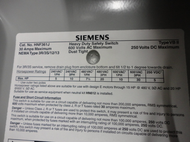 HNF361J SIEMENS, HEAVY DUTY SAFETY SWITCH 30 AMPS, 3 POLE, 600VAC / 250VDC, TYPE VBII. NEMA TYPE 3R, 3S, 12, 13, DUST TIGHT ENCLOSURE.
